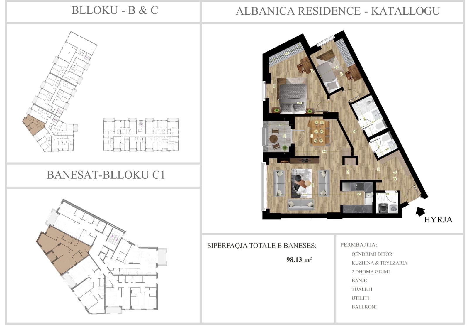 Banesa ndodhet në Lagjen Prishtina e Re, ndodhet tek banesat e Albanices Banesa posedon një sipërfaqe prej 98m2, ndodhet në katin e 3-të me ashensor funksional. Ndërtim e sipër, përfundon në fund të vitit 2025. Pranohet komplenzim me banesë ne Gilan ose Vetur.