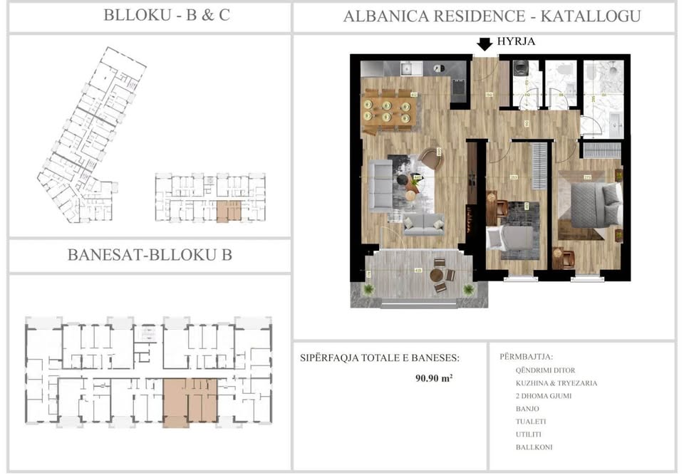 Banesa ndodhet në Lagjen Prishtina e Re, në kompleksin “Albanica Homes”.Blloku B, llamella B1. Objekti është ndërtim e sipër dhe pritet të përfundoj rreth muajit Prill 2025. Banesa posedon një sipërfaqe prej 90.90m2, ndodhet në katin e 2-të, posedon ashensor funksional.