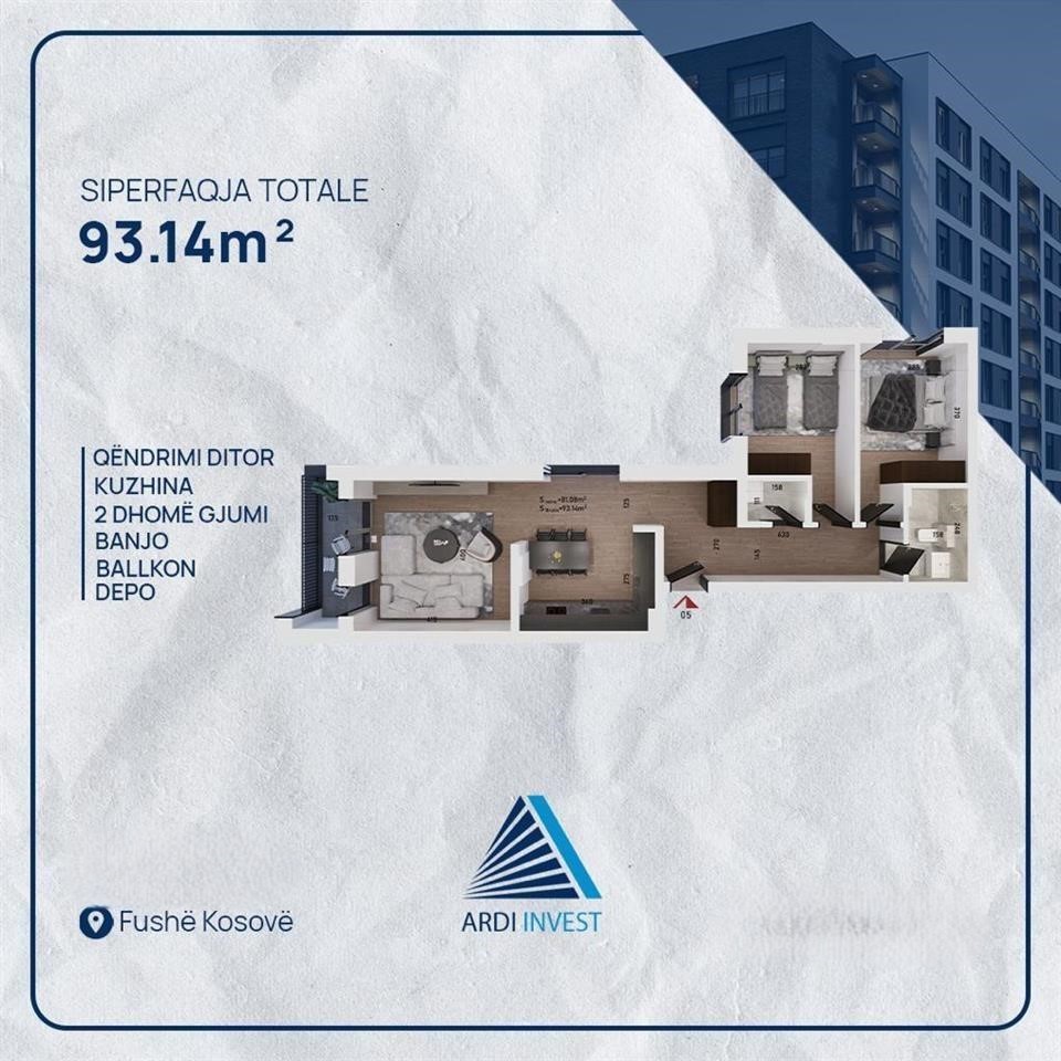 Ofrohet Banesë për shitje në Fushë Kosovë, Invesitor Ardi Invest. Sipërfaqja: 93.14m2, gjendet në katin e 4-të dhe posedon ashensor funksional.