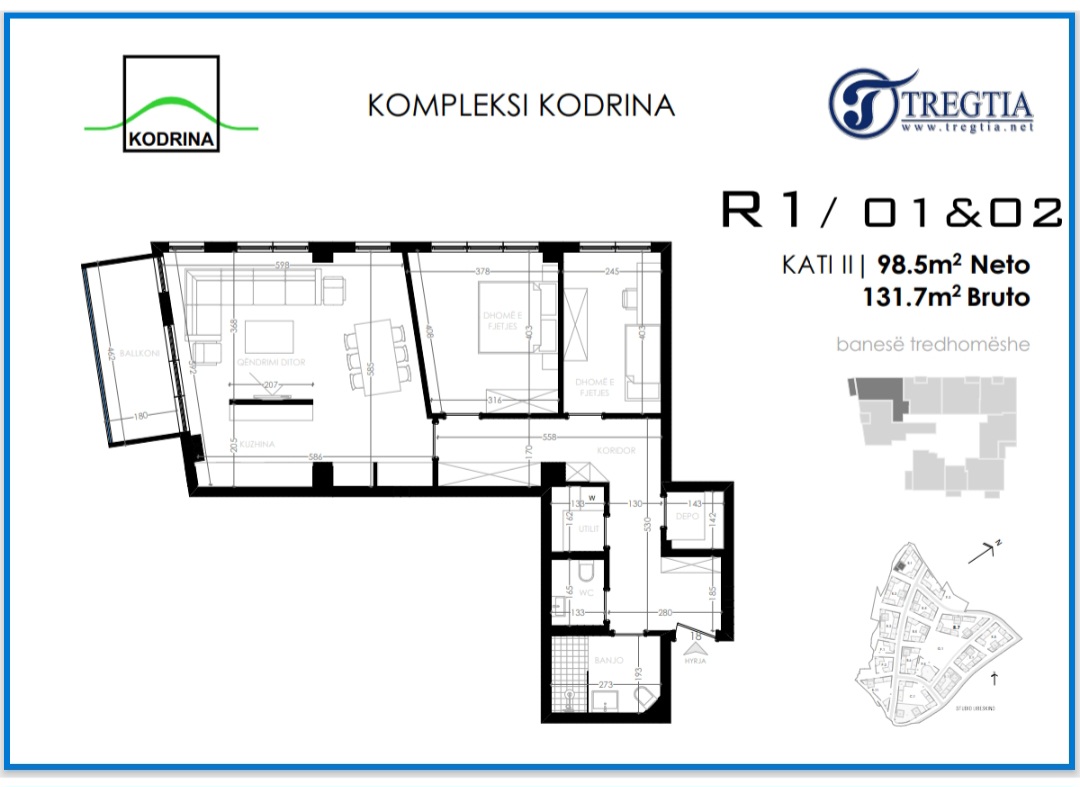 Banesë për Shitje në Lagjen Kodrina, te Kulla e parë, tek banesat e Kodrines. Banesa është e gatshme në fund të 2025. Sipërfaqja: Banesa posedon një sipërfaqe prej 98m2, ndodhet në katin e 2-të, posedon ashensor funksional. Banesa përfshin në çmim garazhd dhe depo.