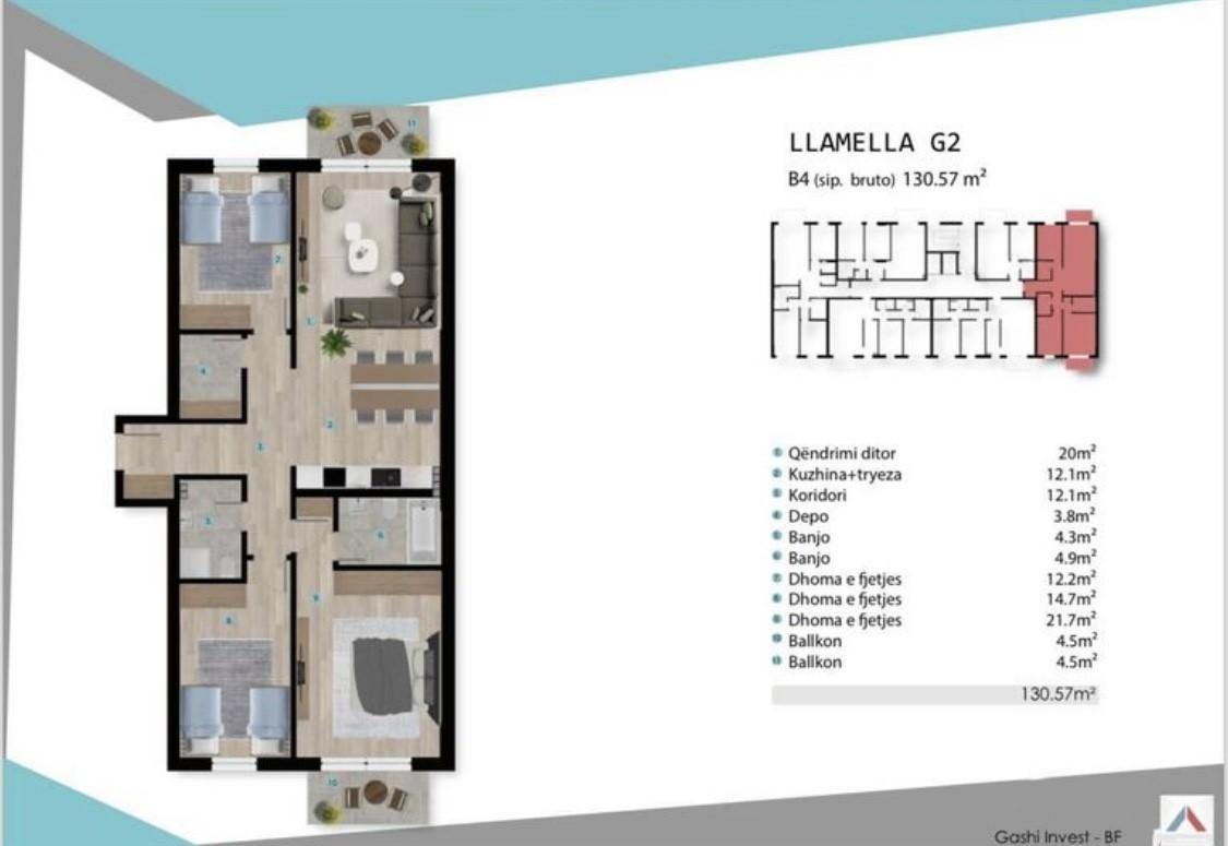 Banesa ndodhet në Lagjen Prishtina e Re, tek kompleksi “Gashi Invest BF”, afër gjykatës. Sipërfaqja: Banesa posedon një sipërfaqe prej 130.57m2, me orientim nga parku i kompleksit dhe nga qyteti.